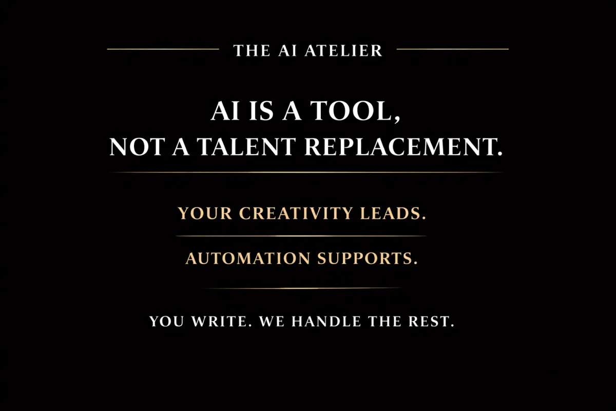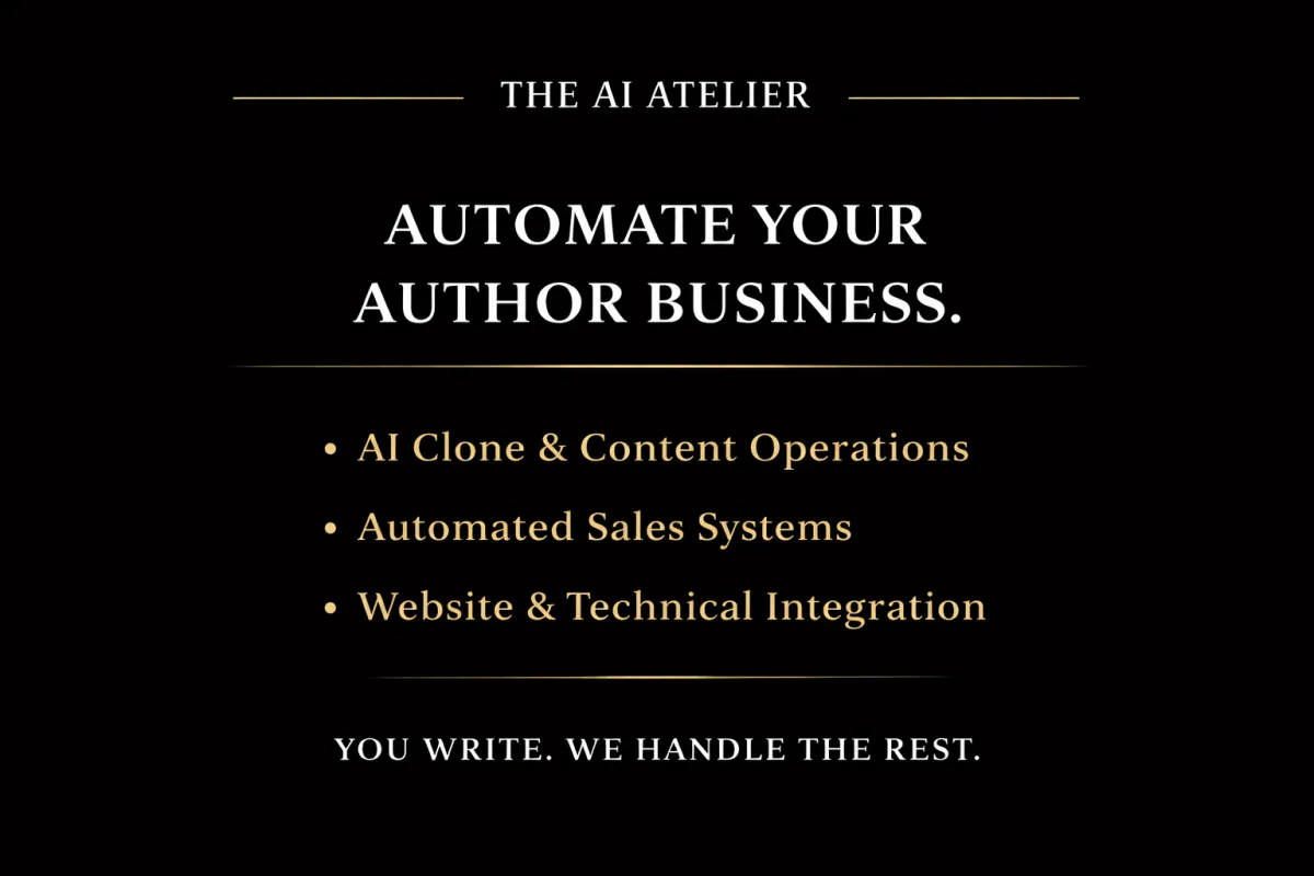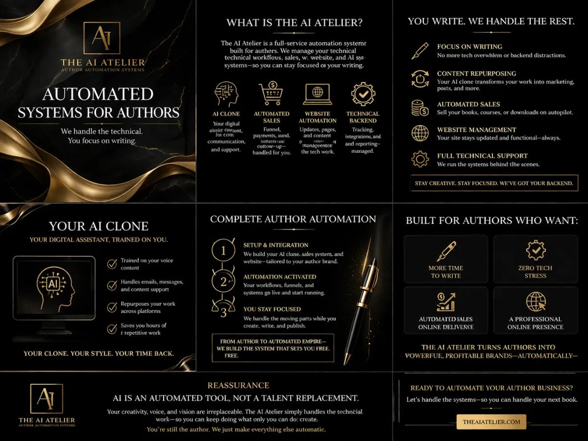 The AI Atelier is a complete automation system for authors. It handles all the technical, sales, and backend tasks so you can focus entirely on writing.